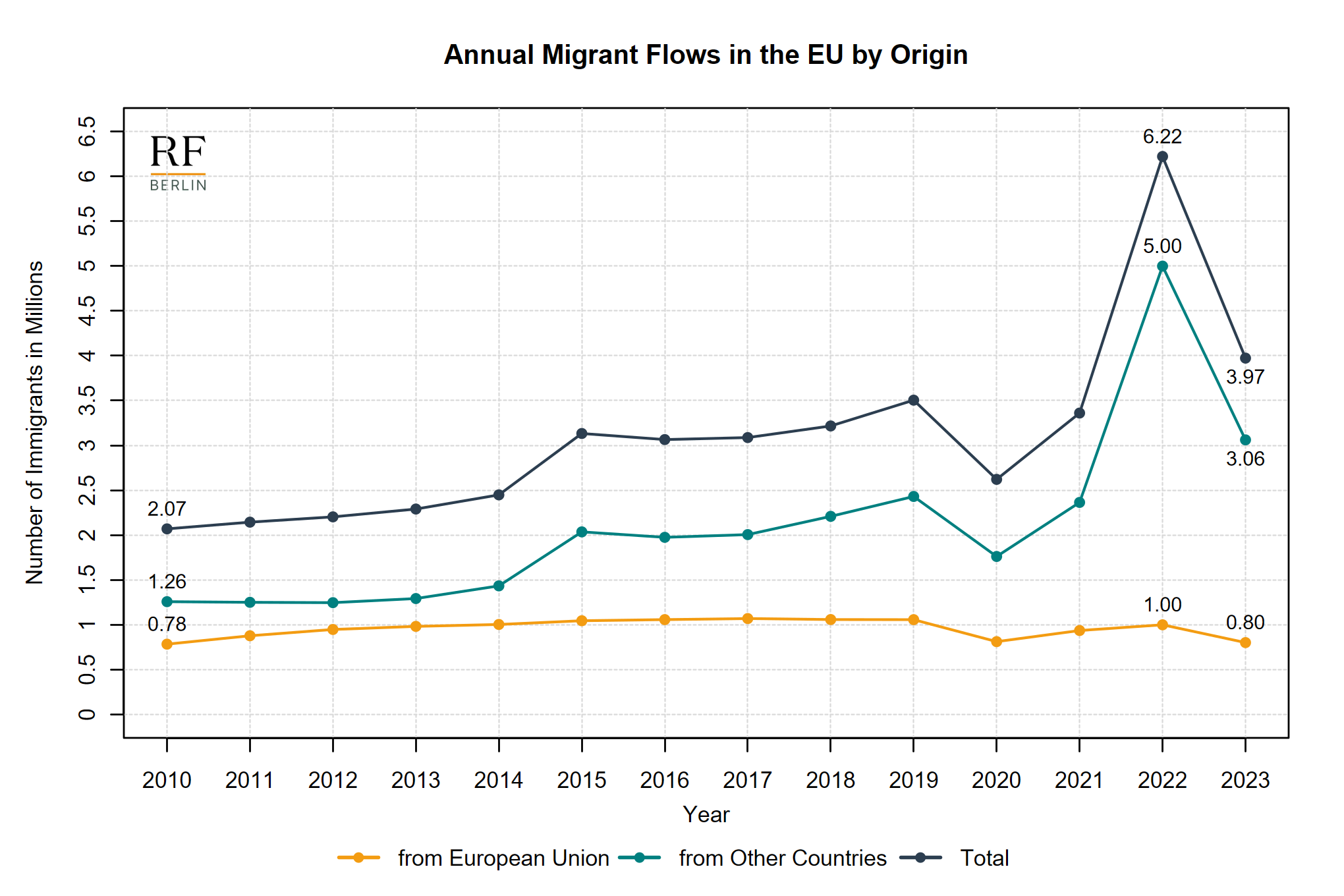 - After peaking at 6.2 million in 2022, migrant inflows dropped to 4 million in 2023, with 77% coming from non-EU countries.