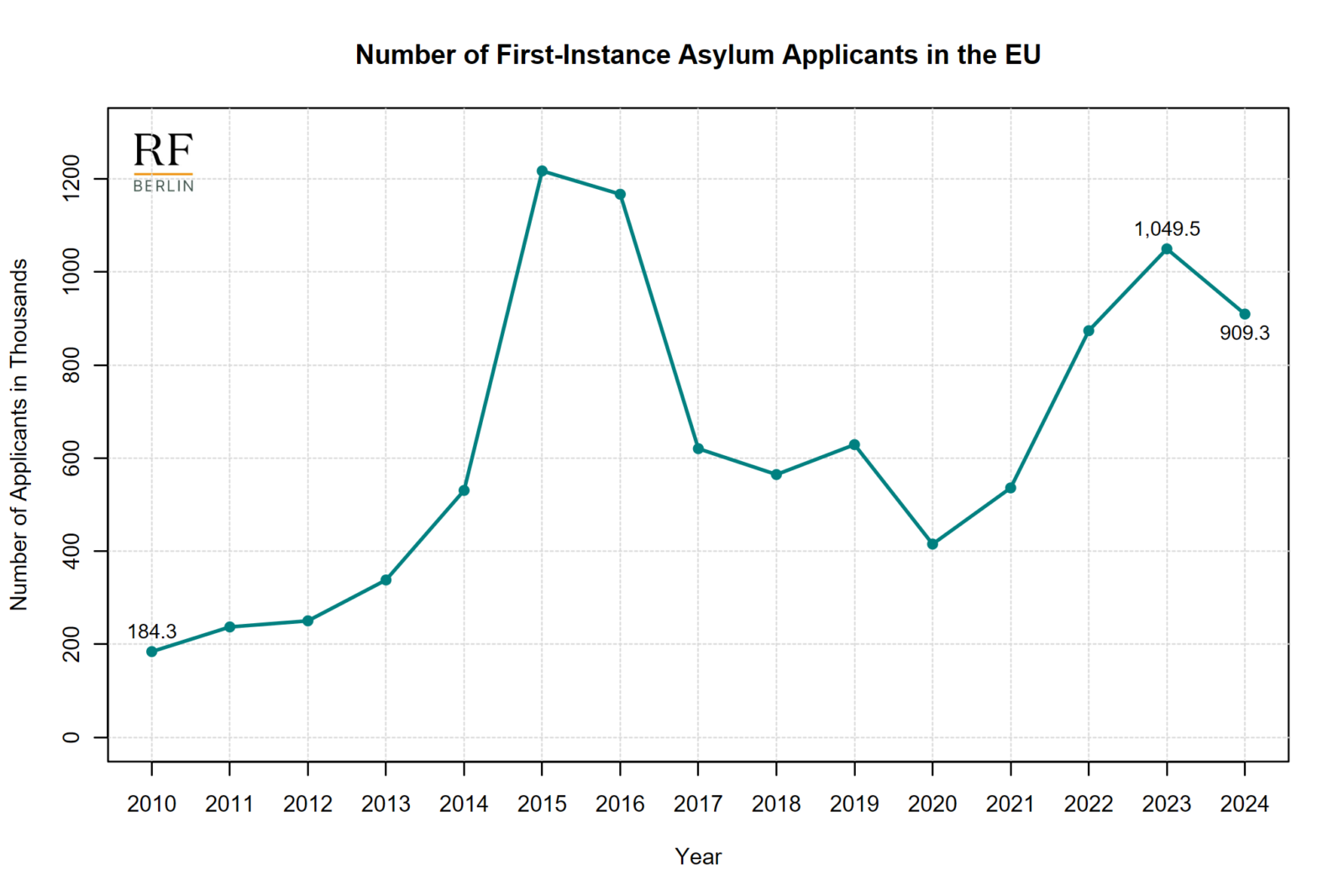 - Asylum applications in the EU surpassed 1 million in 2023 and decreased to 0.9 million in 2024.