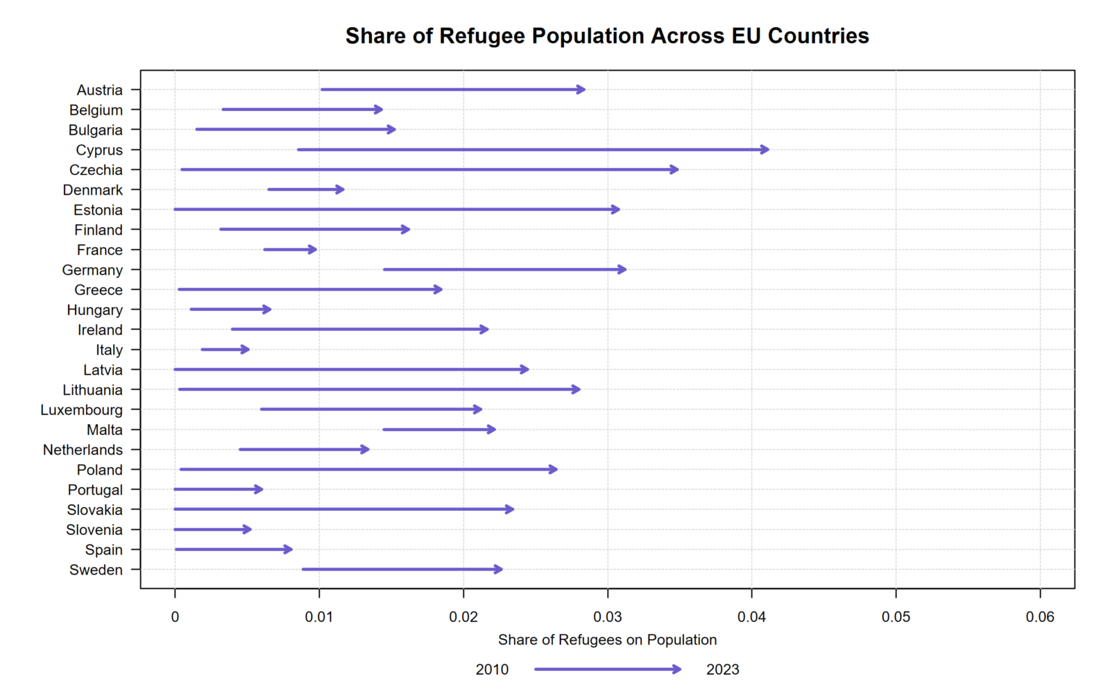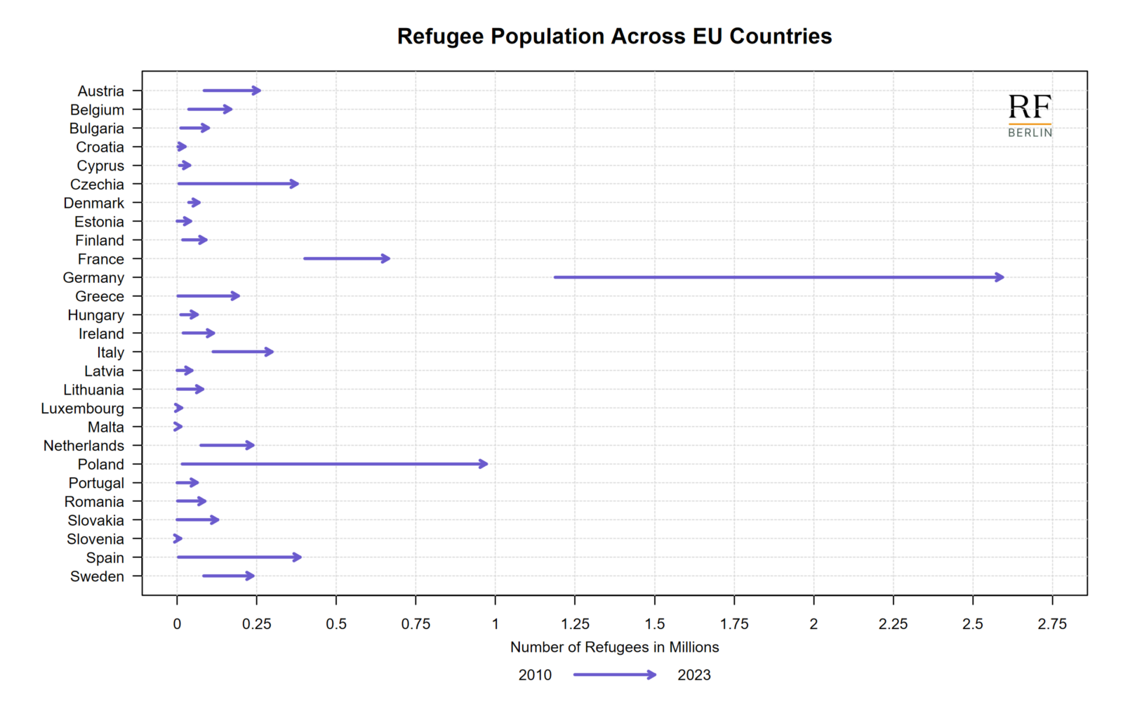 Figure 7 shows the change in the refugee population between 2010 and 2023 across the 27 EU countries. Germany, Poland, Spain, Czechia, and France experienced the largest growth in the number of refugees, with Germany seeing its refugee population double over the period, reaching 2.6 million by 2023 (3.1% of the total population and 14.9% of the foreign-born population)[3]. Overall, the EU’s refugee population increased from 2.1 million in 2010 to 7.4 million in 2023 (i.e., from 0.5% to 1.7% of the total population and from 5.1% to 12.2% of the foreign-born population)[4].