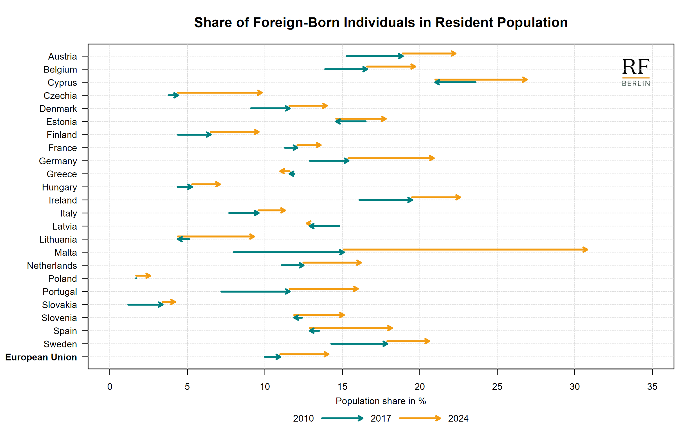 - The share of foreign-born individuals in EU countries has increased from 13.6% in 2023 to 14.1% in 2024.