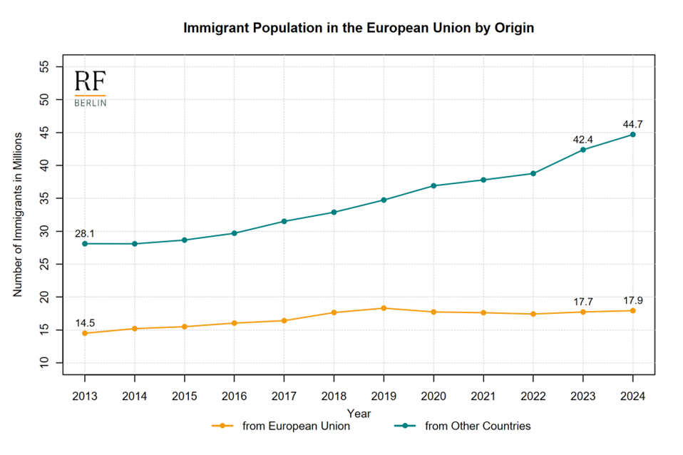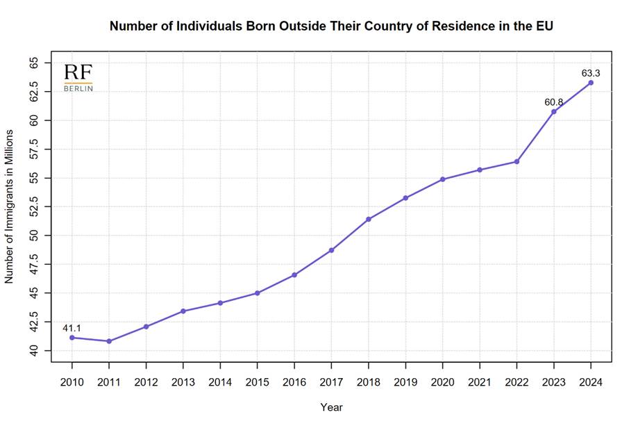 The EU’s foreign-born population has grown steadily from around 41 million in 2010 to over 63 million in 2024, representing an increase from 10% to 14.1% of the total EU population. This rise highlights the EU’s growing role as a destination for individuals migrating from non-EU countries, as well as for those relocating within the EU.