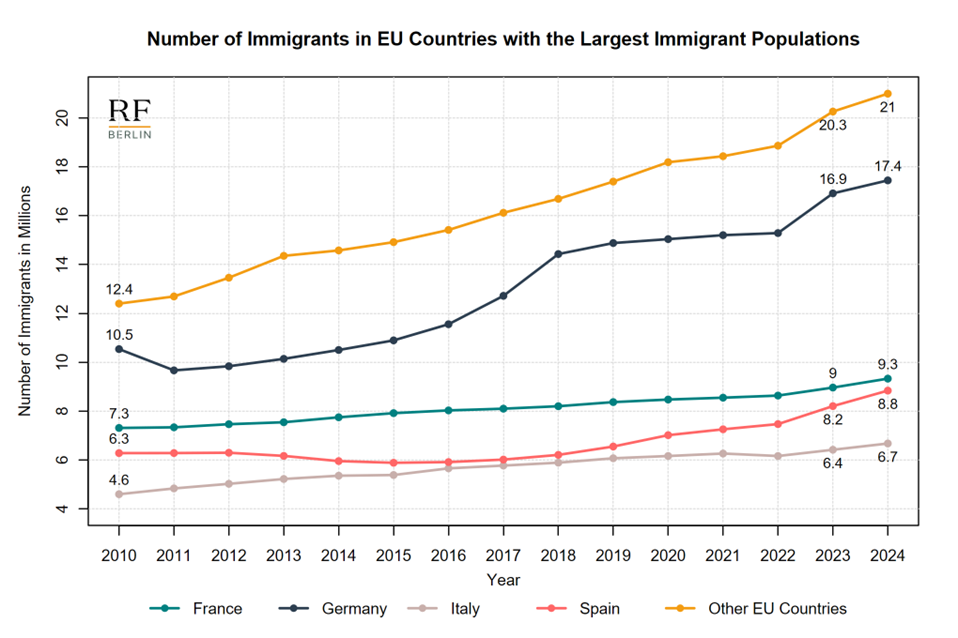 - Germany’s immigrant population rose from 16.9 million in 2023 to 17.4 million in 2024 (or from 20.3% to 20.9% of the population), confirming its role as the major destination in EU.