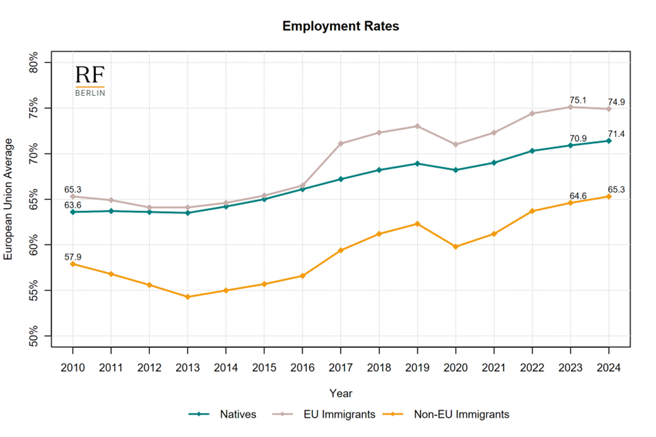 - EU immigrants continue to have higher employment rates than both natives (71.4%) and non-EU immigrants. The gap between the two immigrant groups narrowed slightly in 2024, from 10.5 to 9.6 percentage points.