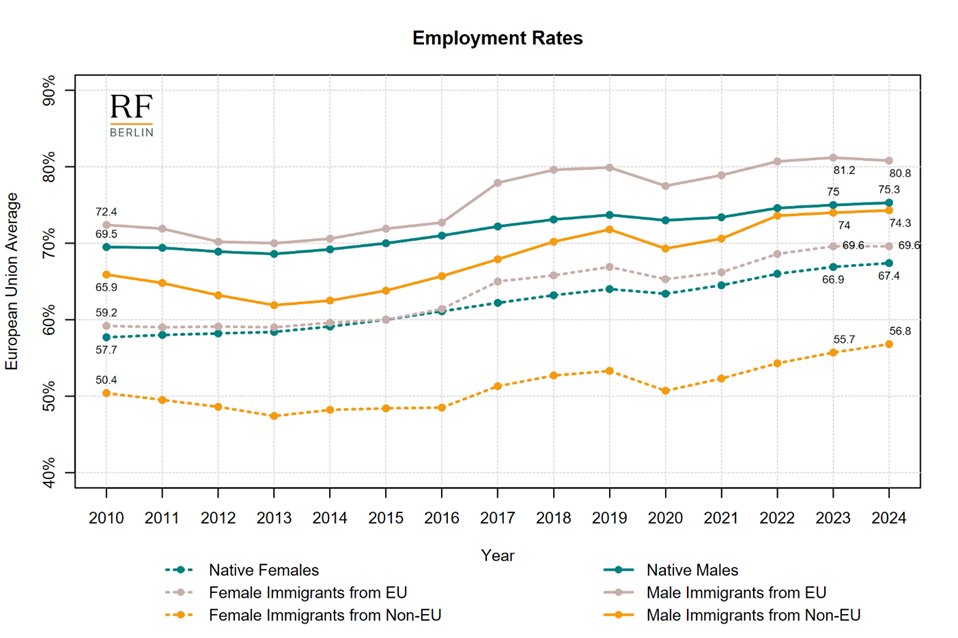 - The employment gap between natives and non-EU migrants is driven by differences in female employment probability. Among men, the gap is minimal: in 2024, the employment rate of non-EU men was 74.3%, just one percentage point below that of native men (75.3%).