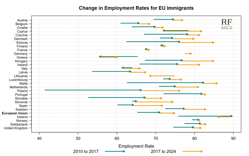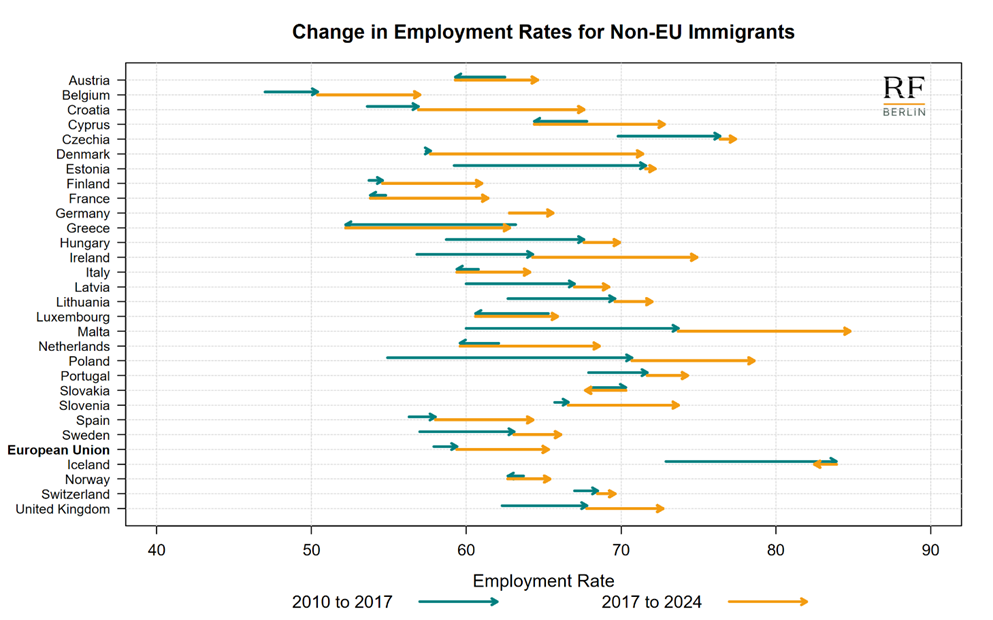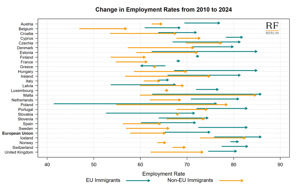 For non-EU immigrants, in addition to Poland, the largest improvements in employment rates between 2010 and 2024 were recorded in Malta, Ireland, and Denmark (Figures 3 and A.2).