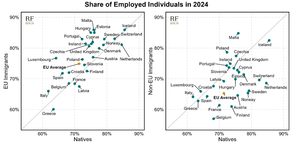 Source: Eurostat, LFSA_ERGAEDCOB. Notes: the figure reports the employment rates of EU and non-EU immigrants versus natives in each country in 2024. The employment rate is the share of employed individuals in the population aged 15 to 64 for the respective group. Immigrants are defined as individuals born in a country other than the one in which they reside. The European Union includes all 27 European Member States as of February 1st, 2020.