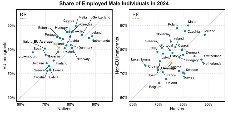 Disaggregating the data by gender confirms these trends: the higher employment rates of EU immigrants relative to natives are observed for both men and women (left panels of Figures A.3 and A.4 in the Appendix). By contrast, the lower labour market integration of non EU immigrants is primarily driven by women (right panels). Notably, in several countries— such as Poland, Czechia, and Italy—non-EU male immigrants have higher employment rates than native-born men (Figure A.3, right panel).