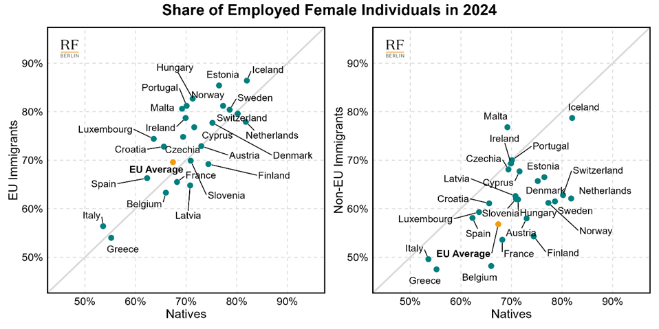 - Employment rates of EU immigrants exceed those of natives across most countries. In contrast, non-EU immigrants tend to have lower employment rates, which is primarily due to lower employment rates among women.