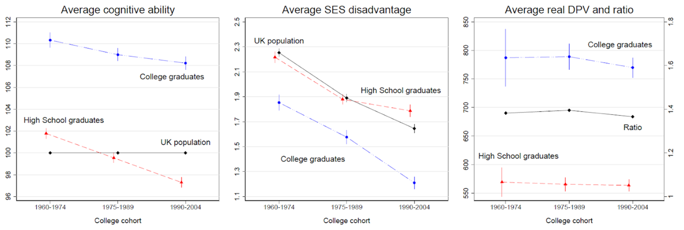Notes: A college cohort is a group of individuals in actual (for graduates) or potential (for non-graduates) college attendance age, labeled by year of birth plus 20 (so, for example, the 1960-74 cohort is composed of subjects born between 1940 and 1954). An individual’s cognitive ability is measured by the first principal component of 14 cognitive ability variables (scores in tests of episodic memory, working memory, fluid reasoning, semantic fluency, and problem solving/numeracy, and whether help was received during the test); this measure is normalized to have a mean of 100 and a SD of 15 in each college cohort. An individual’s disadvantage is measured by the first principal component of 13 socio-economic variables that affect a student possibility to study with profit (years of schooling of a respondent's parents, six dummies for whether a respondent's father or mother were employed when the respondent was 14, whether a respondent was not living with her/his father or mother at the age or 14, and whether a respondent's father or mother were deceased when the respondent was 14); the figure shows the average of this measure by graduation status relative to the population in each college cohort. Average real present discounted values of earnings are expressed in thousands of real GBP (2015 prices). Data sources: Understanding Society.