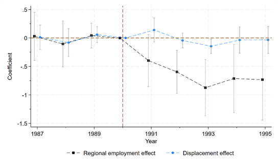 Abbildung 1 zeigt den deutlichen Unterschied zwischen regionalen und individuellen Effekten. Die schwarze Linie spiegelt die Ergebnisse des regionalen Ansatzes wider: Ein Anstieg des Anteils von Zuwanderern an der Beschäftigung um einen Prozentpunkt führt nach drei Jahren zu einem Rückgang der Gesamtbeschäftigung von Einheimischen in der Region um 0,87%. Die blaue Linie hingegen zeigt eine andere Entwicklung für beschäftigte Arbeitnehmer. Sie zeigt die Veränderung der Wahrscheinlichkeit, dass diese weiterhin beschäftigt bleiben (also den negativen Wert des Verdrängungseffekts). Diese Wahrscheinlichkeit sinkt lediglich um 0,14 Prozentpunkte, und der Effekt verschwindet nach fünf Jahren vollständig.
