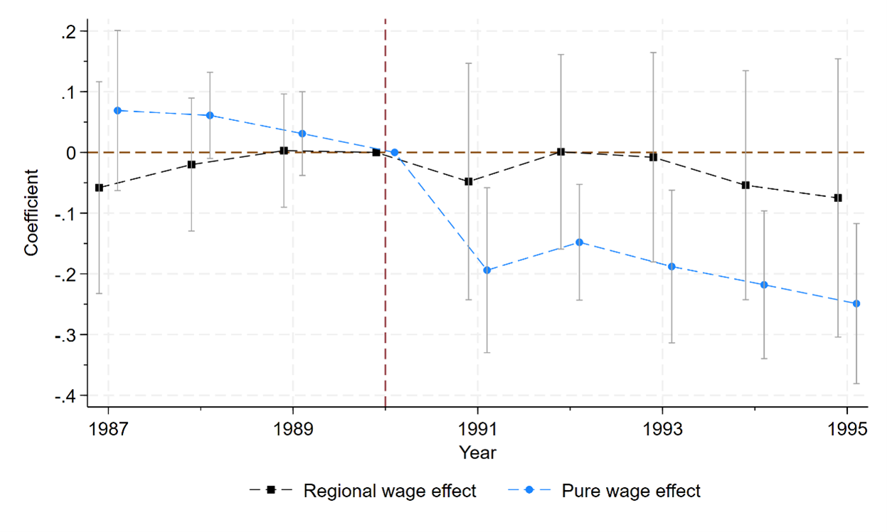 Um diese Effekte voneinander zu trennen, untersuchen wir ein einzigartiges natürliches Experiment, das sich nach dem Fall der Berliner Mauer ergeben hat. Tschechischen Arbeitnehmern wurde erlaubt, in deutschen Grenzregionen zu arbeiten und zu diesem Zweck dorthin zu pendeln, ohne jedoch dort wohnen zu dürfen. Dies führte zu einem reinen Arbeitsangebotsschock, da die Pendler ihre Löhne in Deutschland verdienten, den Großteil ihres Einkommens jedoch im Heimatland ausgaben (siehe Dustmann et al., 2017). Mithilfe von Längsschnittdaten aus der Sozialversicherung, die die gesamte Erwerbsbevölkerung abdecken, untersuchen wir die Erwerbsbiografien der Arbeitnehmer vor und nach der Zuwanderung. Dadurch können wir die Auswirkungen auf beschäftigte Arbeitnehmer von den Gesamt-Effekten auf den lokalen Arbeitsmarkt unterscheiden. Um mögliche Verzerrungen durch eine selektive Auswahl der Arbeitsregionen zu vermeiden (d.h. wirtschaftlich stärkere Regionen erfahren häufig eine höhere Zuwanderung), nutzen wir einen Instrumentalvariablenansatz, bei dem die Entfernung zur Grenze als Instrument dient.