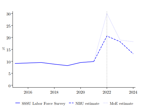 - Unemployment spiked to more than 20% in 2022, then stabilized and is now around 11%, only a couple of percentage points higher than before the war.