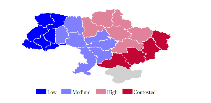 Figure 1 – Ukrainian oblasts by exposure to the conflict (based on terciles of hours of air raid alarms from February 2022 to October 2025, partially occupied oblasts hand-coded as contested)