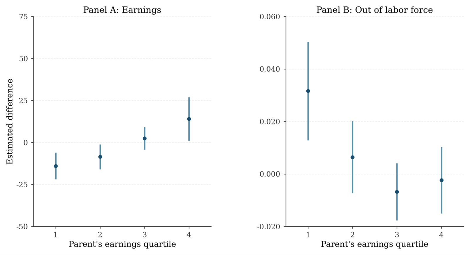 Figure 2 supports this mechanism. It shows how automation affected the parents themselves across the income distribution. Panel A shows that earnings losses are concentrated among low-income parents in robot-intensive industries, while Panel B shows they are also more likely to leave the labour force altogether. These parental shocks closely mirror the adverse outcomes for their children shown in Figure 1.