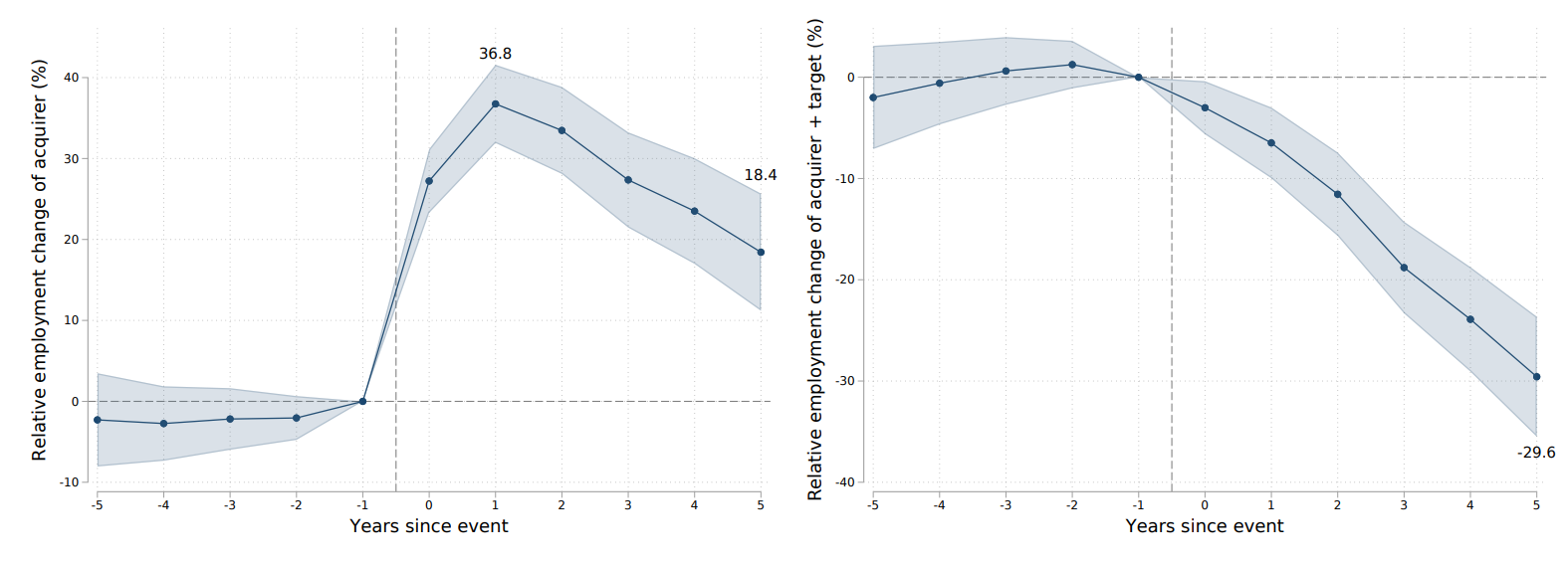 Notes: This figure shows average employment changes of firms undergoing an acquisition relative to comparable firms undergoing an acquisition 7 years later. Changes are measured in percent relative to the year prior to the acquisition. Panel (a) shows the outcome of the acquiring firm only, and panel (b) shows total employment of the acquiring and target firm combined. Shaded areas indicate 95 percent confidence intervals, illustrating statistical uncertainty of the estimates.