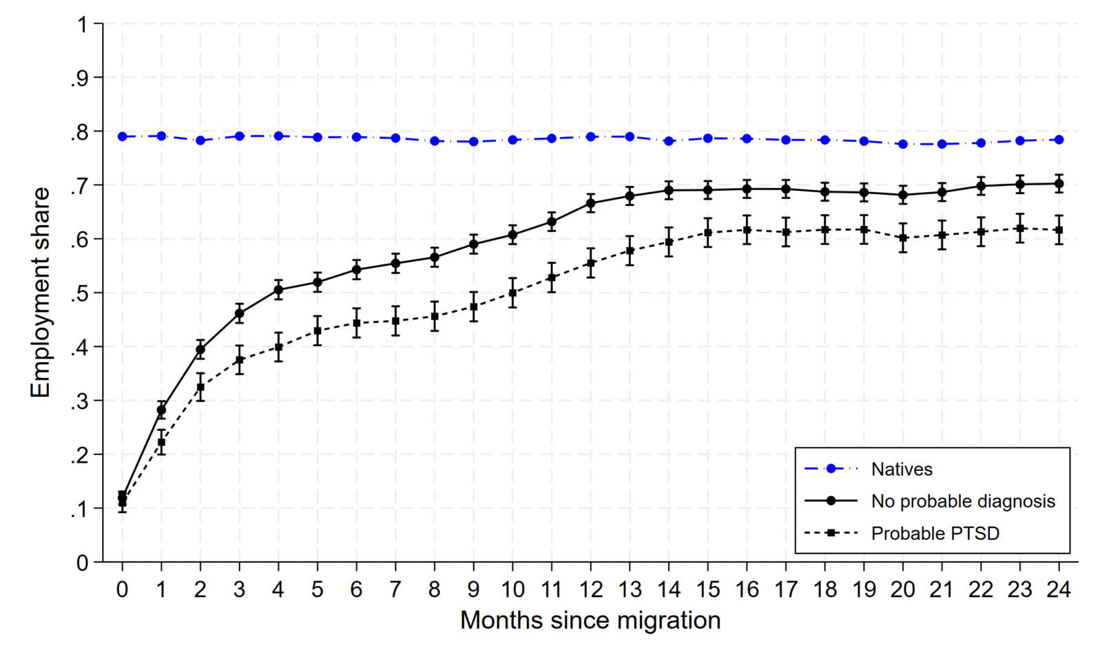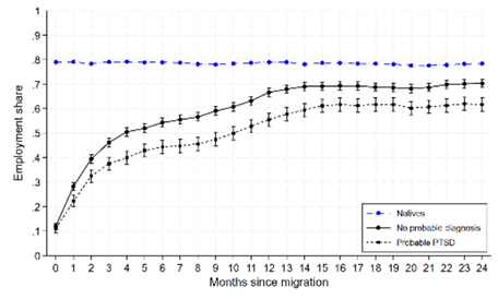 Figure 1 shows that refugees with early PTSD symptoms have weaker employment trajectories after arrival. Employment rises steeply in the first months for all refugees, but the refugees with PTSD  stay consistently below refugees without PTSD  throughout the two-year window. After accounting for differences in education and household composition,a 7.4 percentage-point lower employment rate for those with probable PTSD persists. The difference emerges early and then stabilizes after roughly one year, rather than narrowing over time.